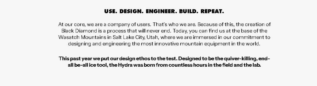 Bound by our undying passion for climbing, skiing and mountain adventure, Black Diamond Equipment employees number more than 500 worldwide. Our passion is what drives us to relentlessly design, engineer and build the world’s best climbing, skiing and mountain equipment.
