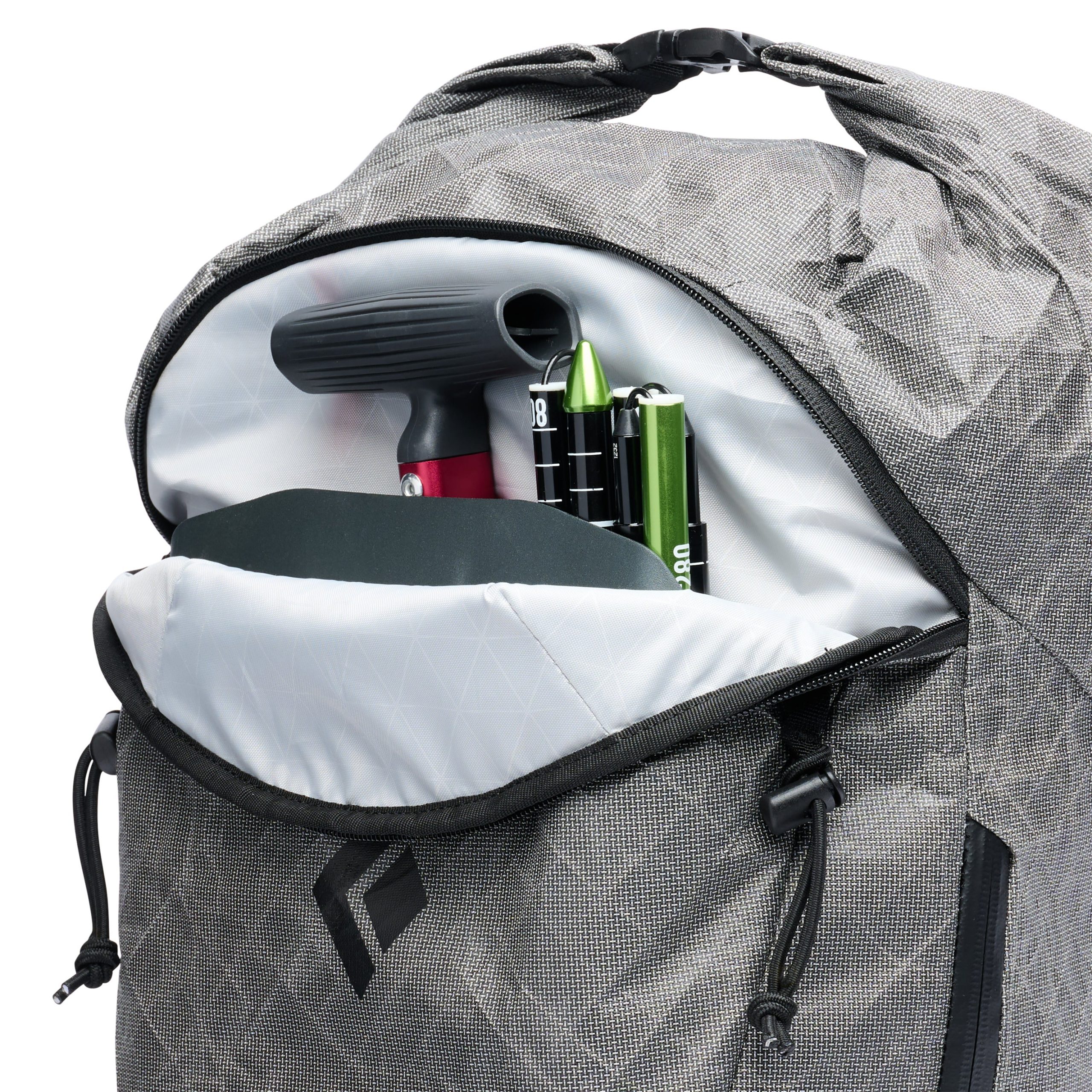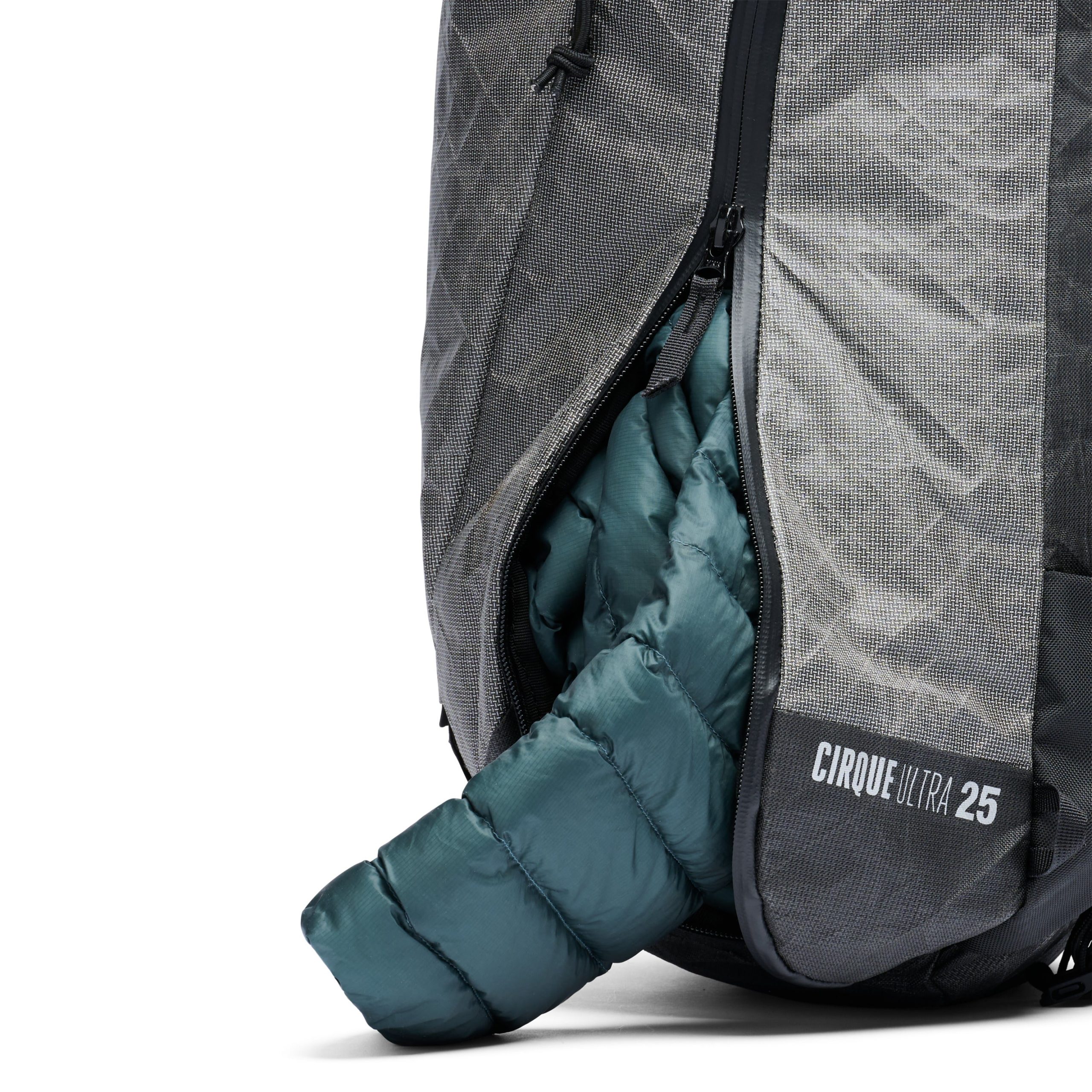 The Cirque Ultra 25 is minimalist. with a roll-top closure. diagonal ski carry strap. and a quick-access external pocket for avy gear. We partnered with Challenge Sailcloth to bring their Ultra? 200D and 400D body fabric to our Cirque series to create one of the lightest. yet most durable. ski packs out there. The Cirque Ultra 25 also has side compartments for skins and crampons that can be accessed from the outside and is hydration and radio compatible. With side access to the main body. lightweight materials. and minimal frills. the Cirque 25 is the lightest and most dialed backcountry pack we make.