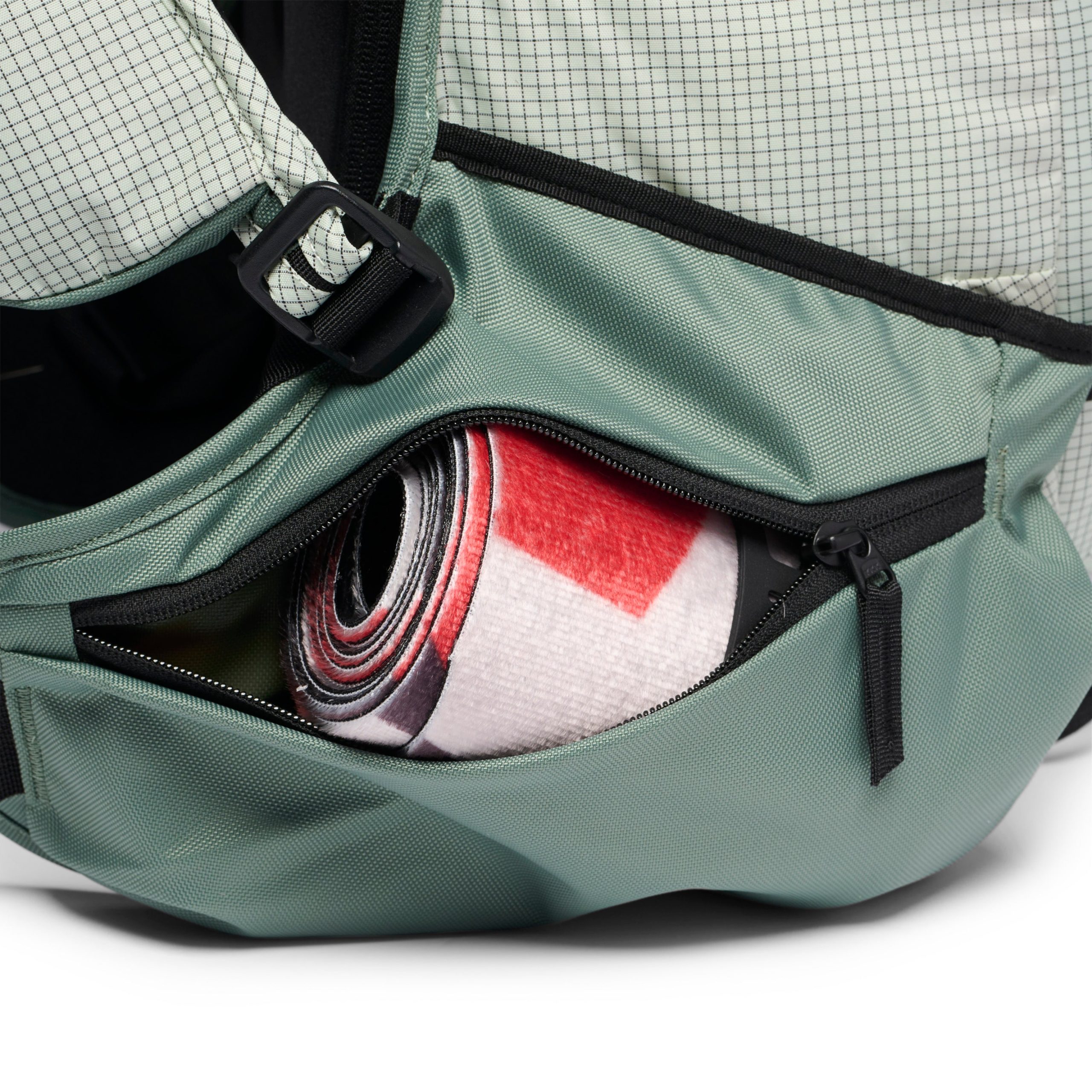 The front snow safety pocket stores your avalanche safety kit. and an oversized insulated shoulder pocket holds a hydration tube. soft flask or radio. The pack’s form-fitting suspension provides a contoured. body-hugging fit. while the zippered back-panel access provides easy entry. Large hip-belt pockets are purpose-built to store skins for the downhill. and exterior attachment points accommodate skis. snowboards. helmet. and piolets.