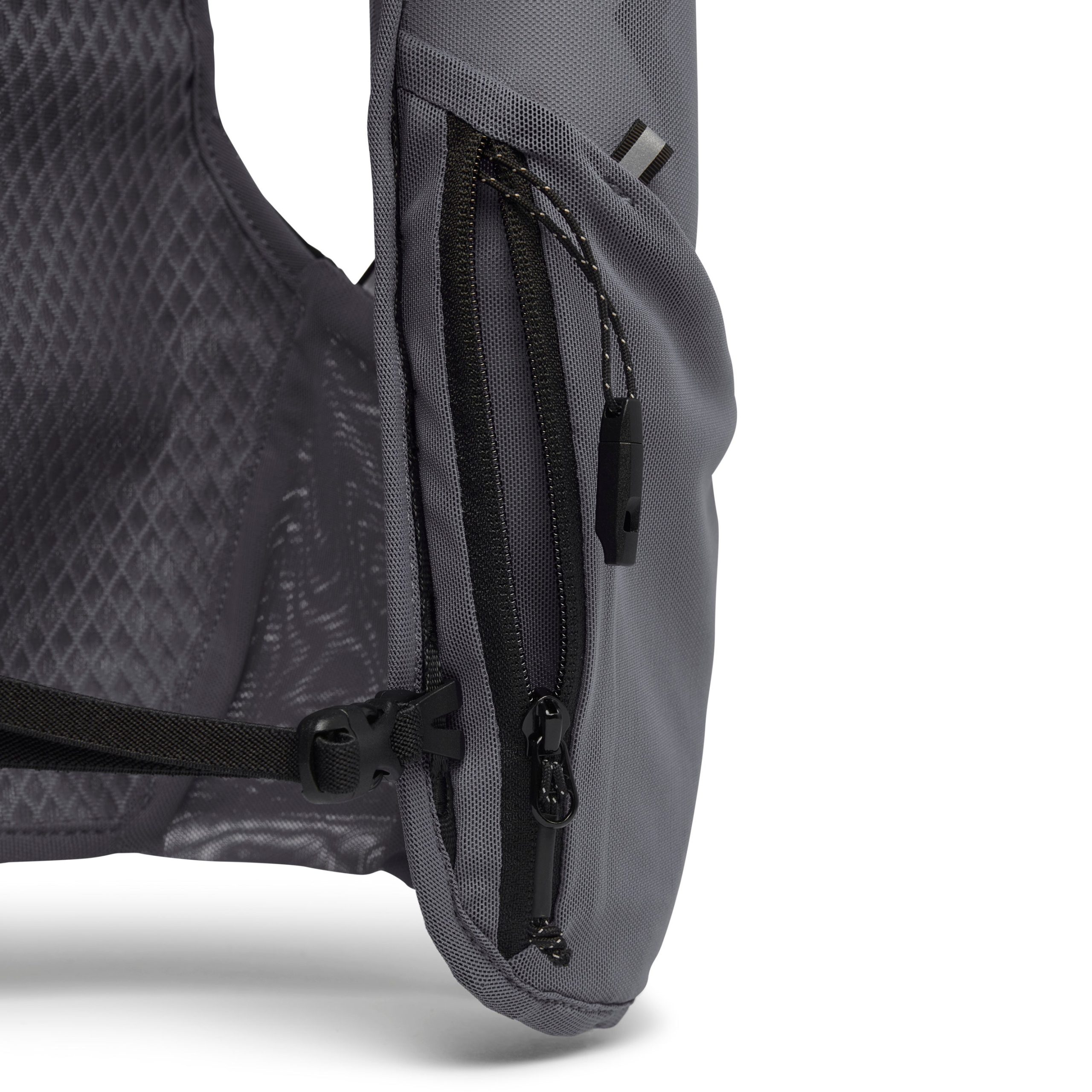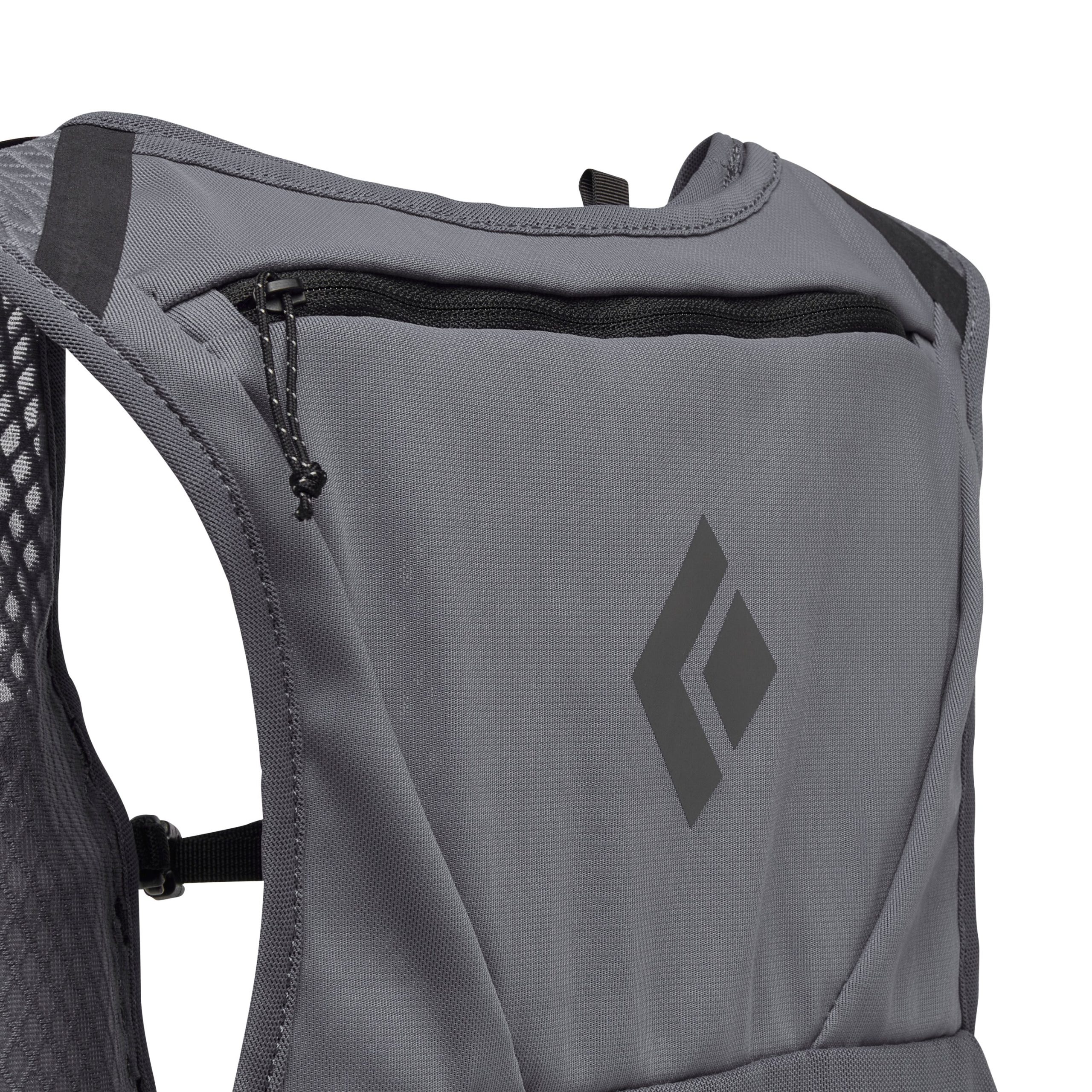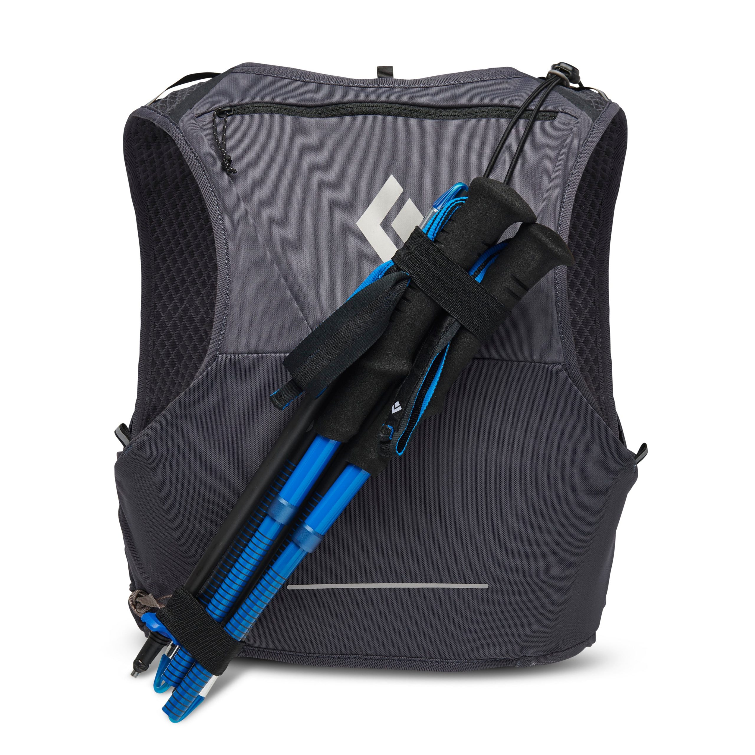 An over the shoulder Z-Pole carry system can be easily deployed on the go. while high stretch side panels extend from the harness itself for an improved fit while on the move. This harness design also provides quick-access side pockets. Lighter colorways provide temperature regulation and better visibility. Dual flask pockets fi t two BD HydraPak? SoftFlasks? – which are included with the vest – while a zippered chest pocket. lumbar and back zip security pockets and small stash pockets provide ample storage for essential supplies.