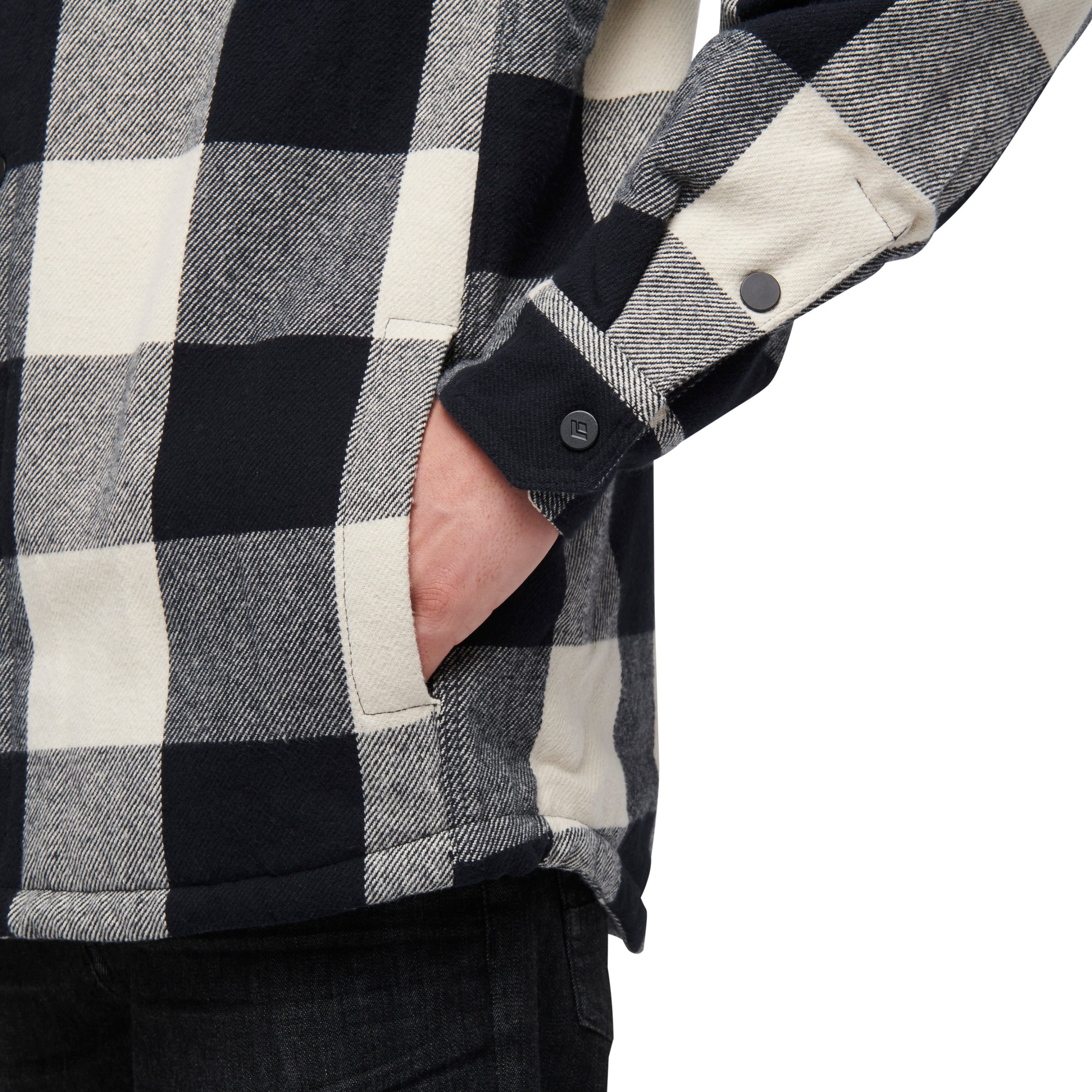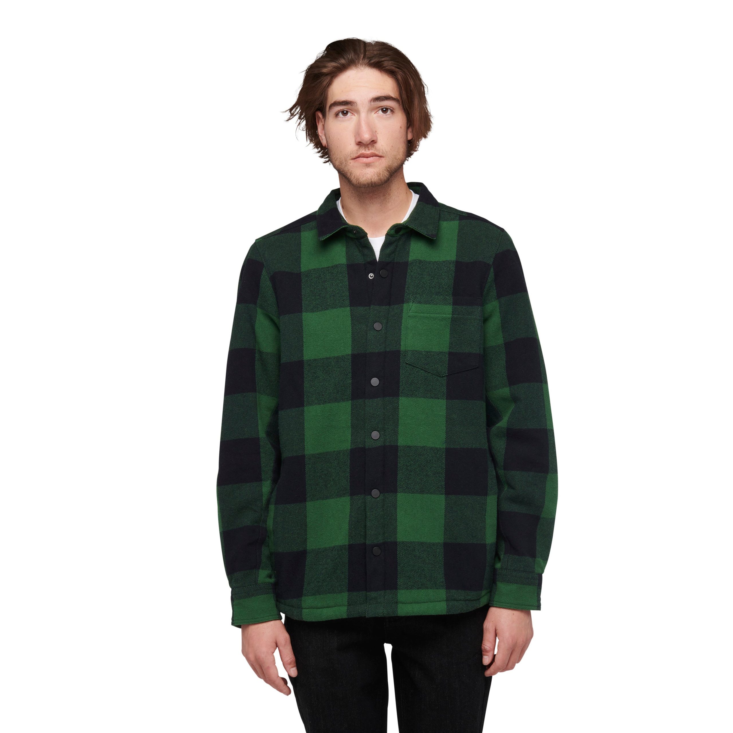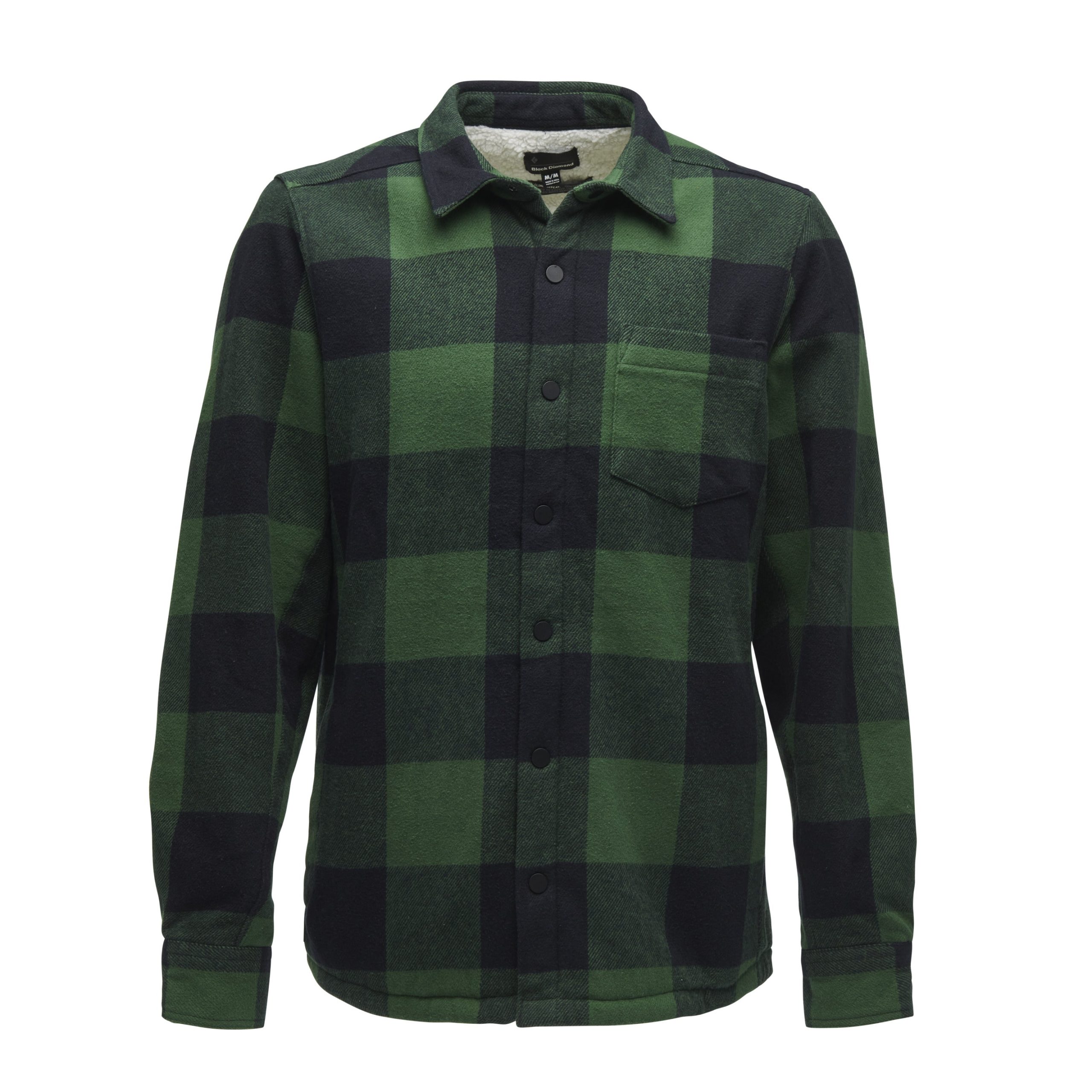 Constructed with a brushed organic cotton outer layer and a cozy. recycled polyester sherpa fleece lining. this is the most insulated flannel in the line. Nylon lining in the sleeves and a boxy fit makes it easy to wear with other bulky layers. Additional features include easy to operate snap closure and a single front chest pocket.