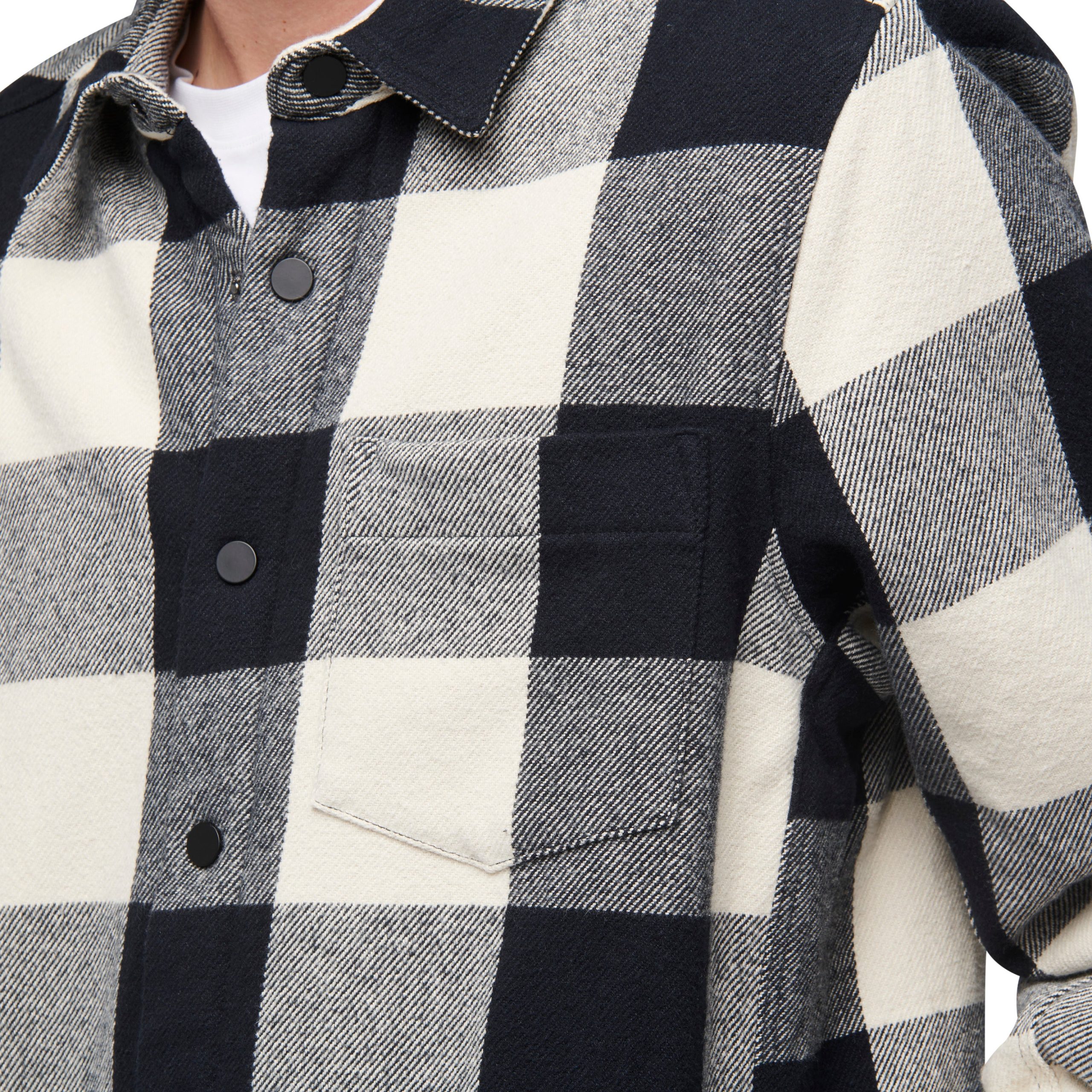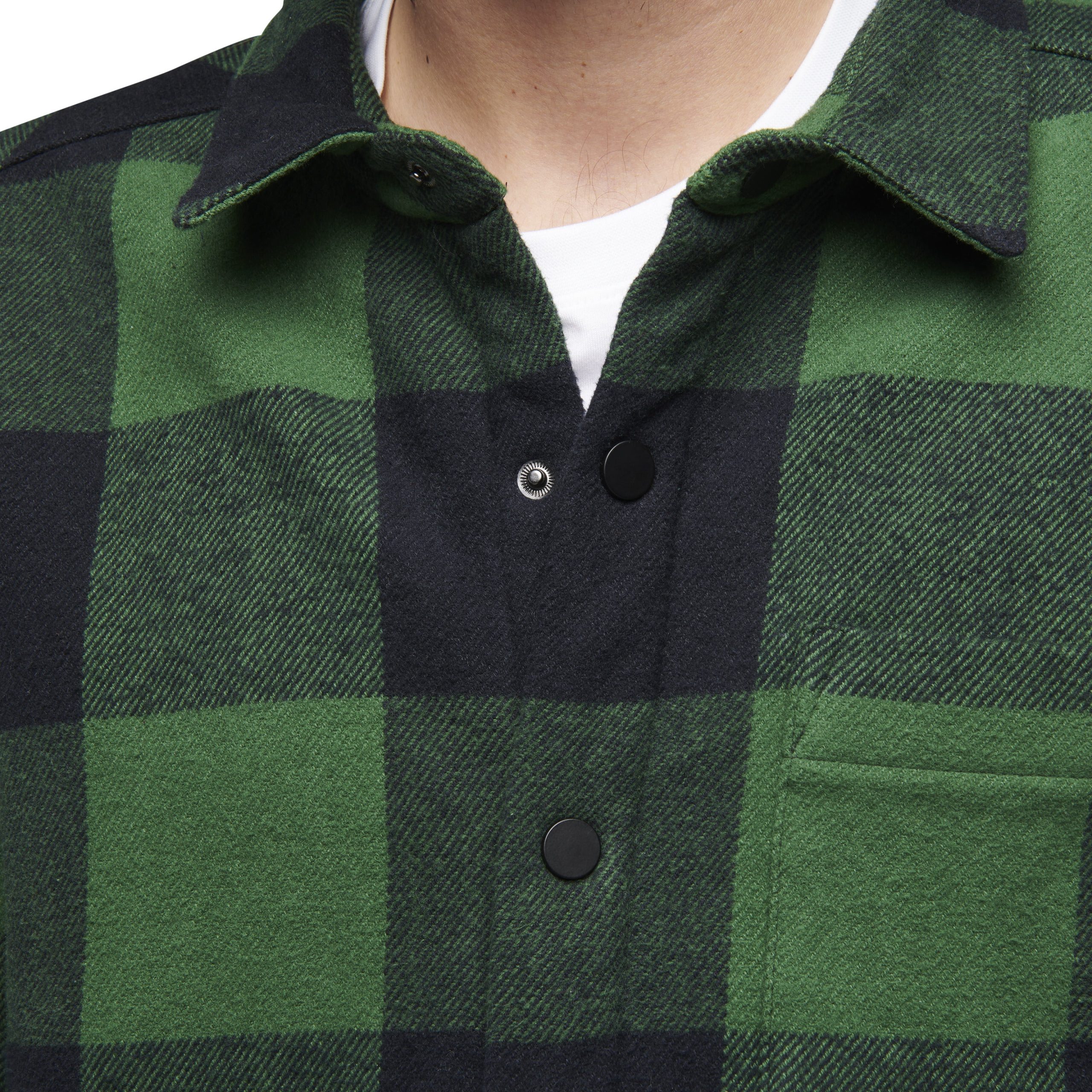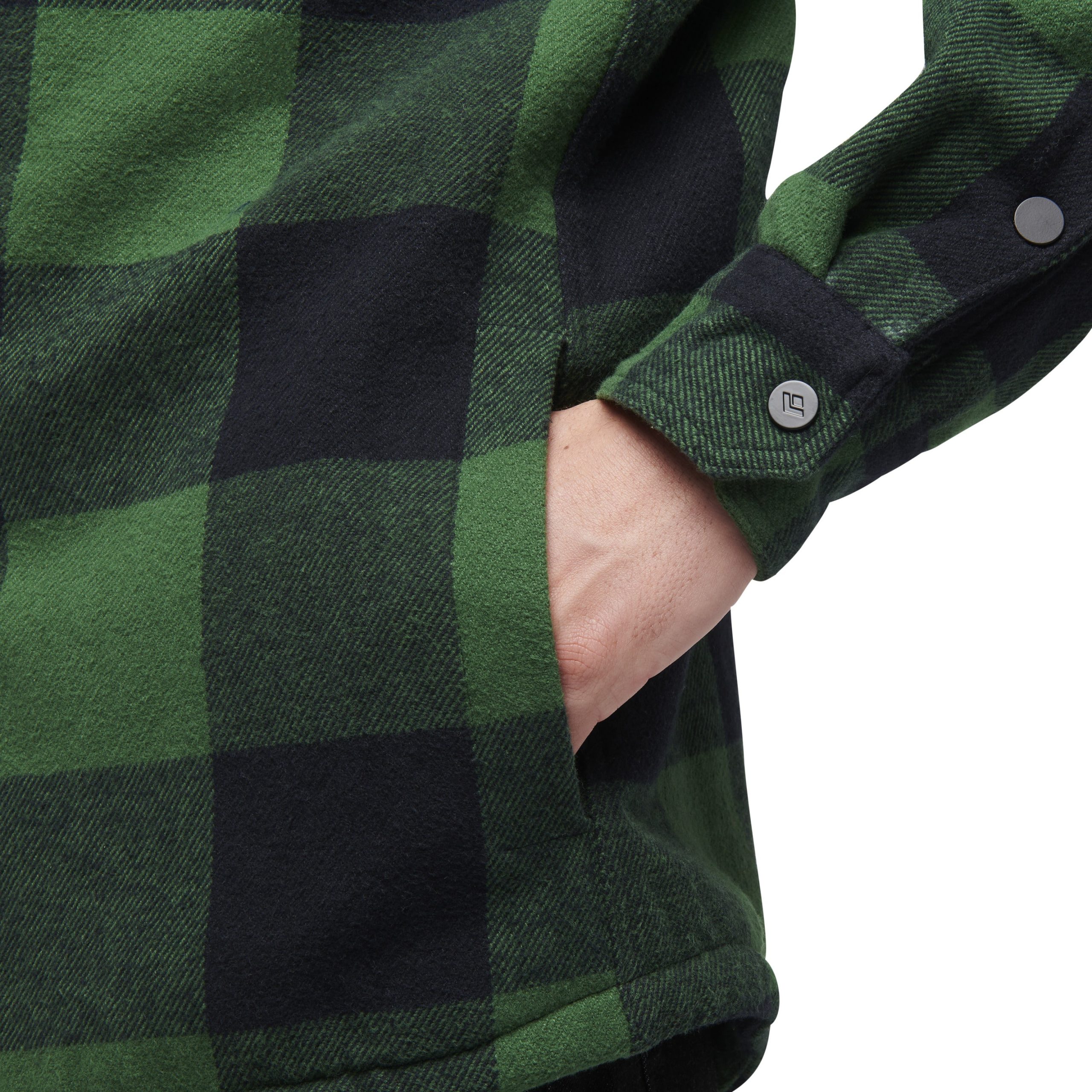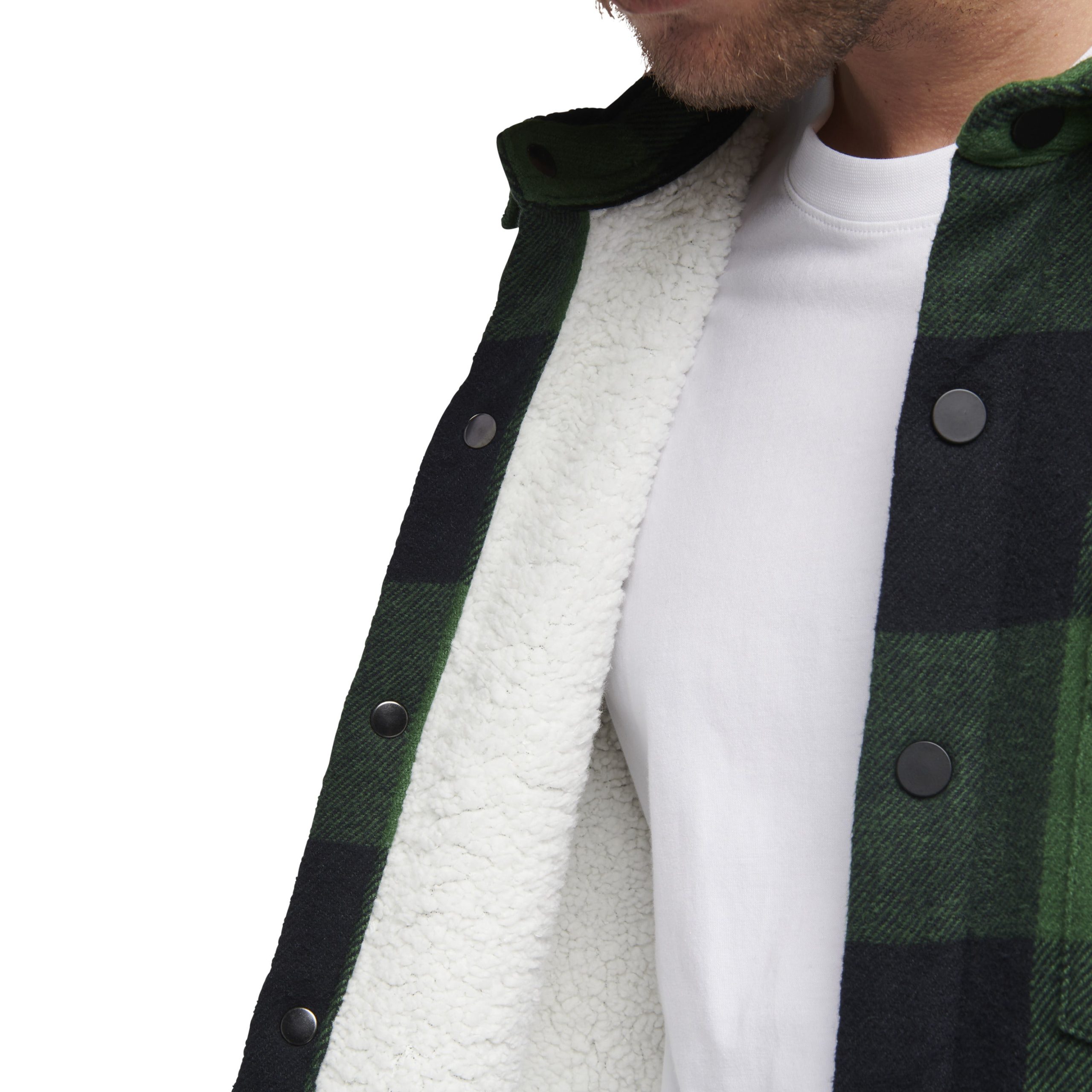 Constructed with a brushed organic cotton outer layer and a cozy. recycled polyester sherpa fleece lining. this is the most insulated flannel in the line. Nylon lining in the sleeves and a boxy fit makes it easy to wear with other bulky layers. Additional features include easy to operate snap closure and a single front chest pocket.