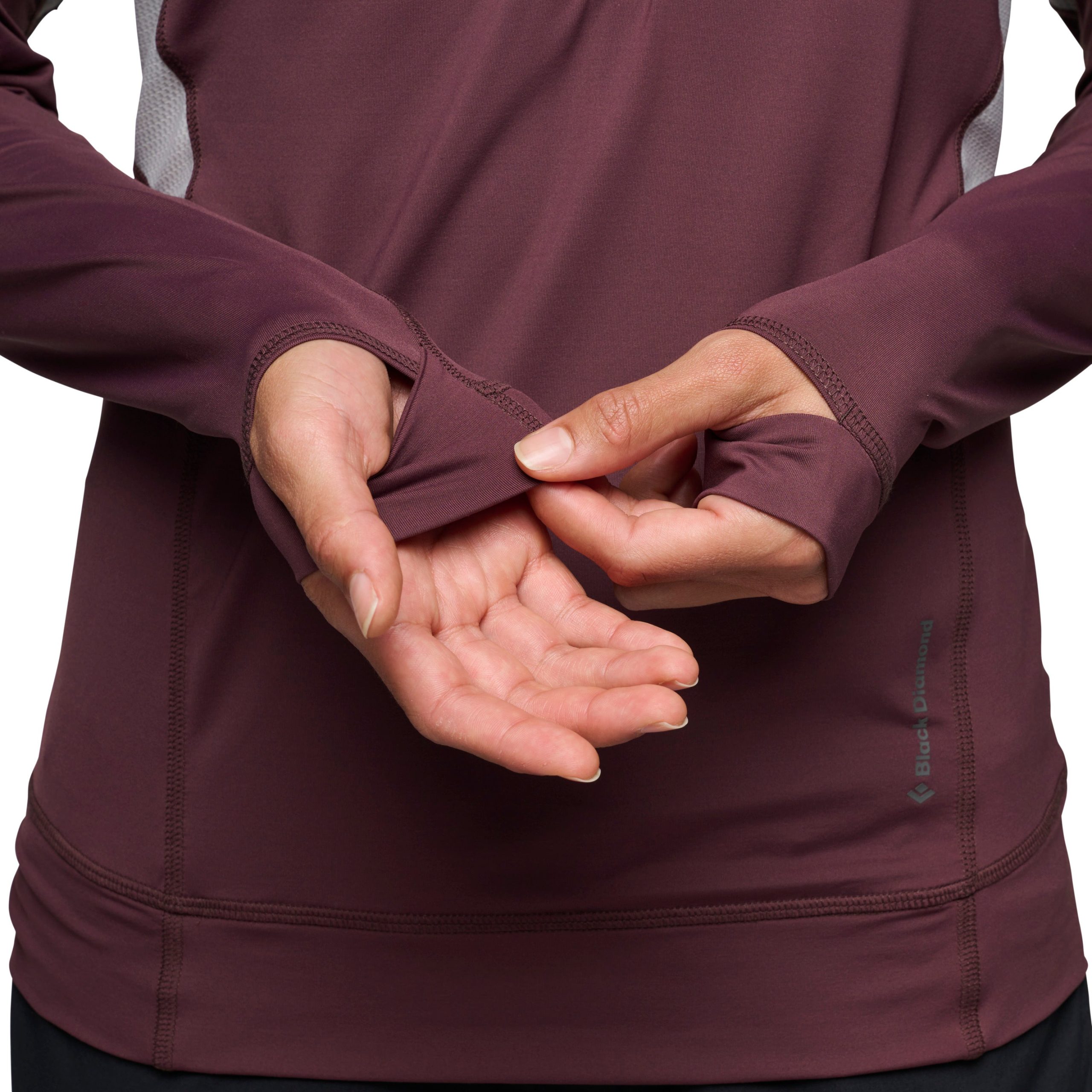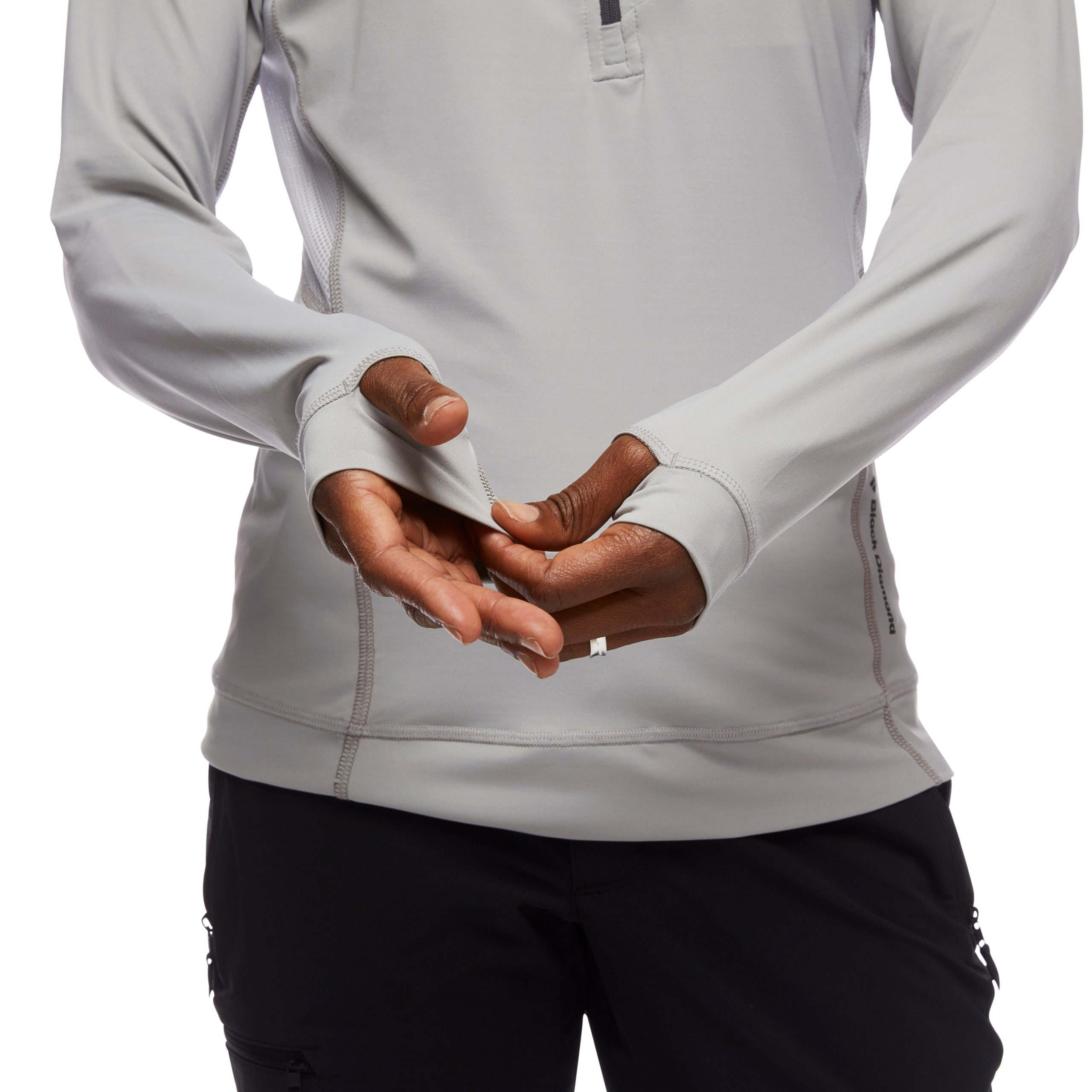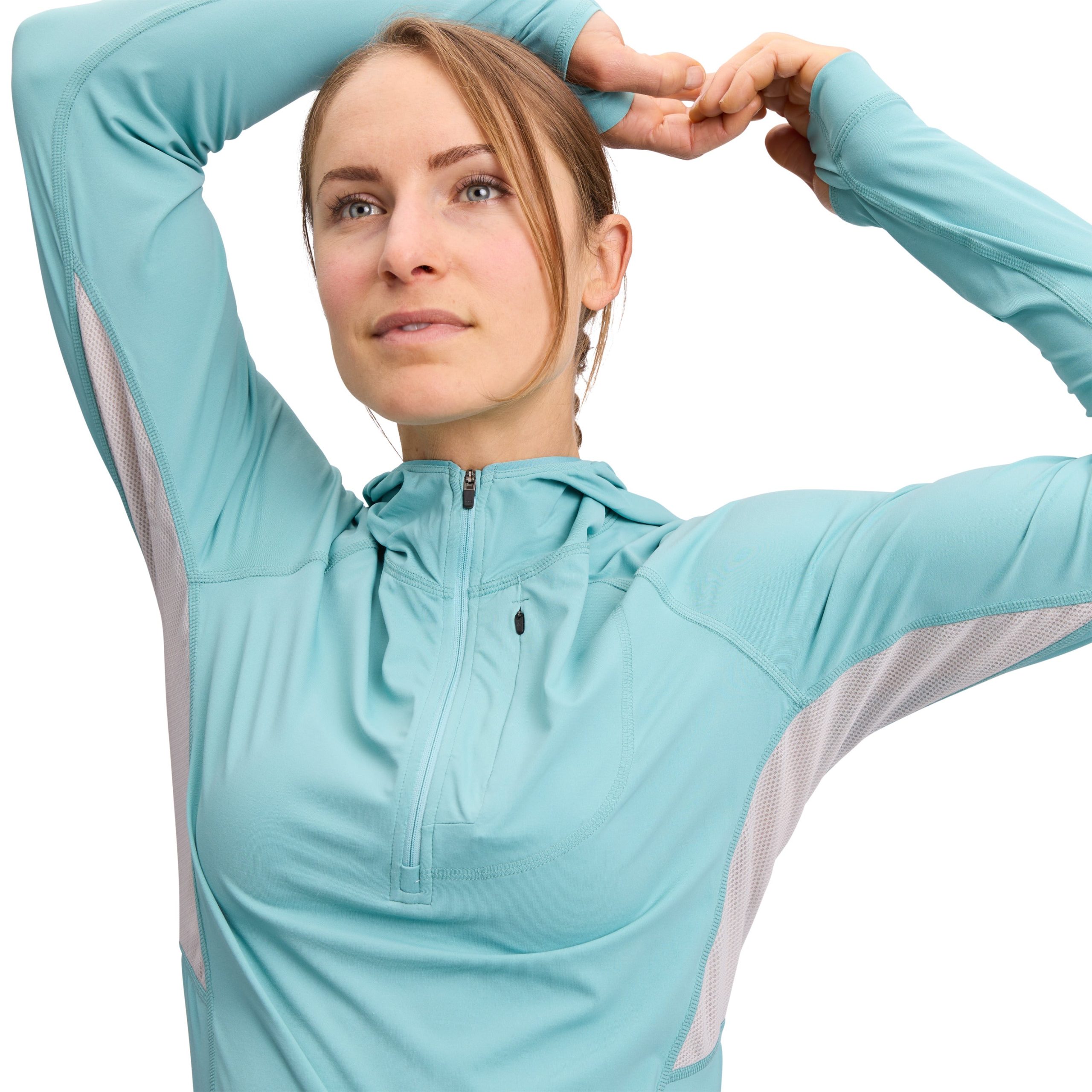 The Alpenglow Pro sports a ? zip opening for regulating body temperature. HeiQ Pure underarm mesh panels for extra breathability. a concealed chest pocket. thumb-loops. and an over-the-helmet compatible hood. making this hoody an essential layer from the desert to the alpine.