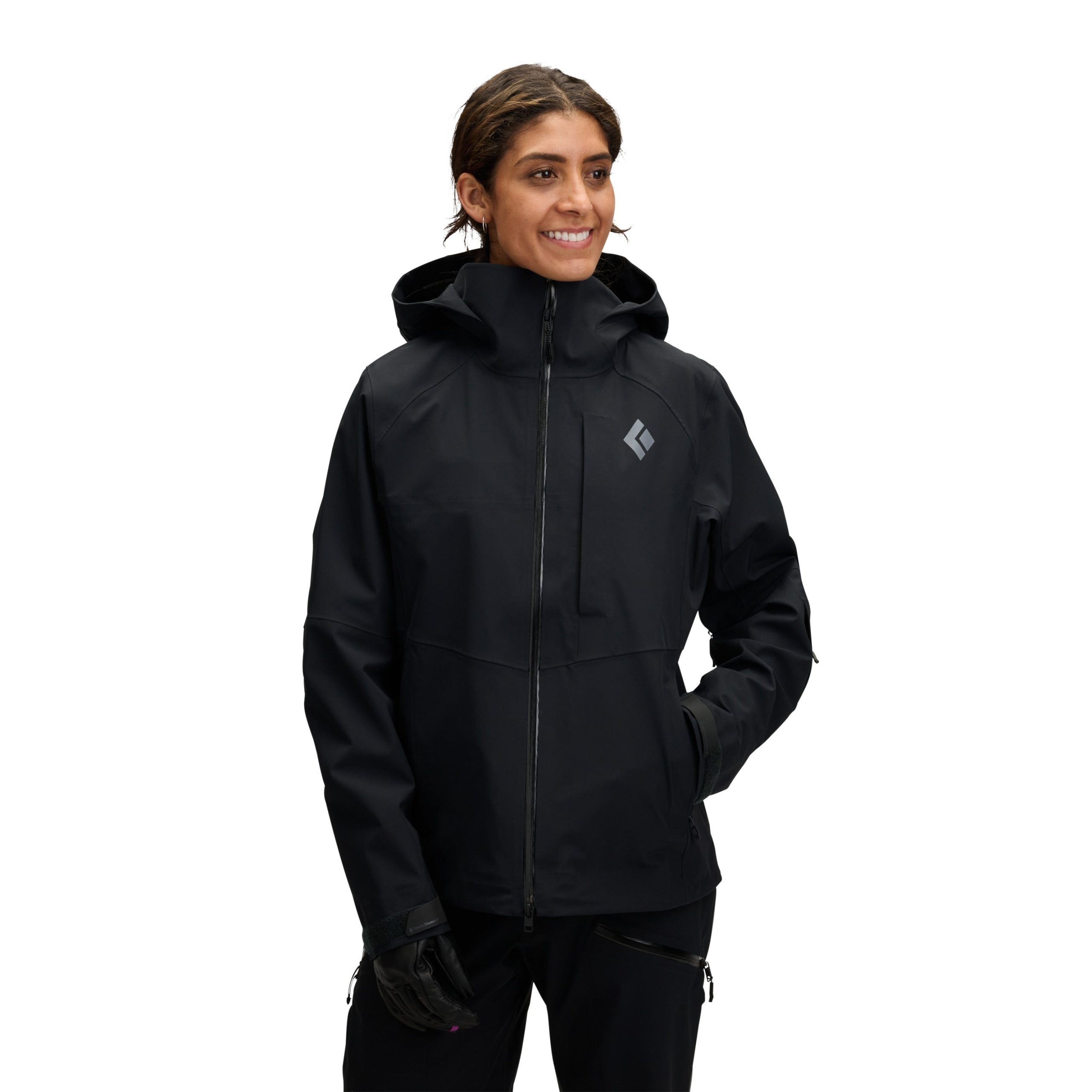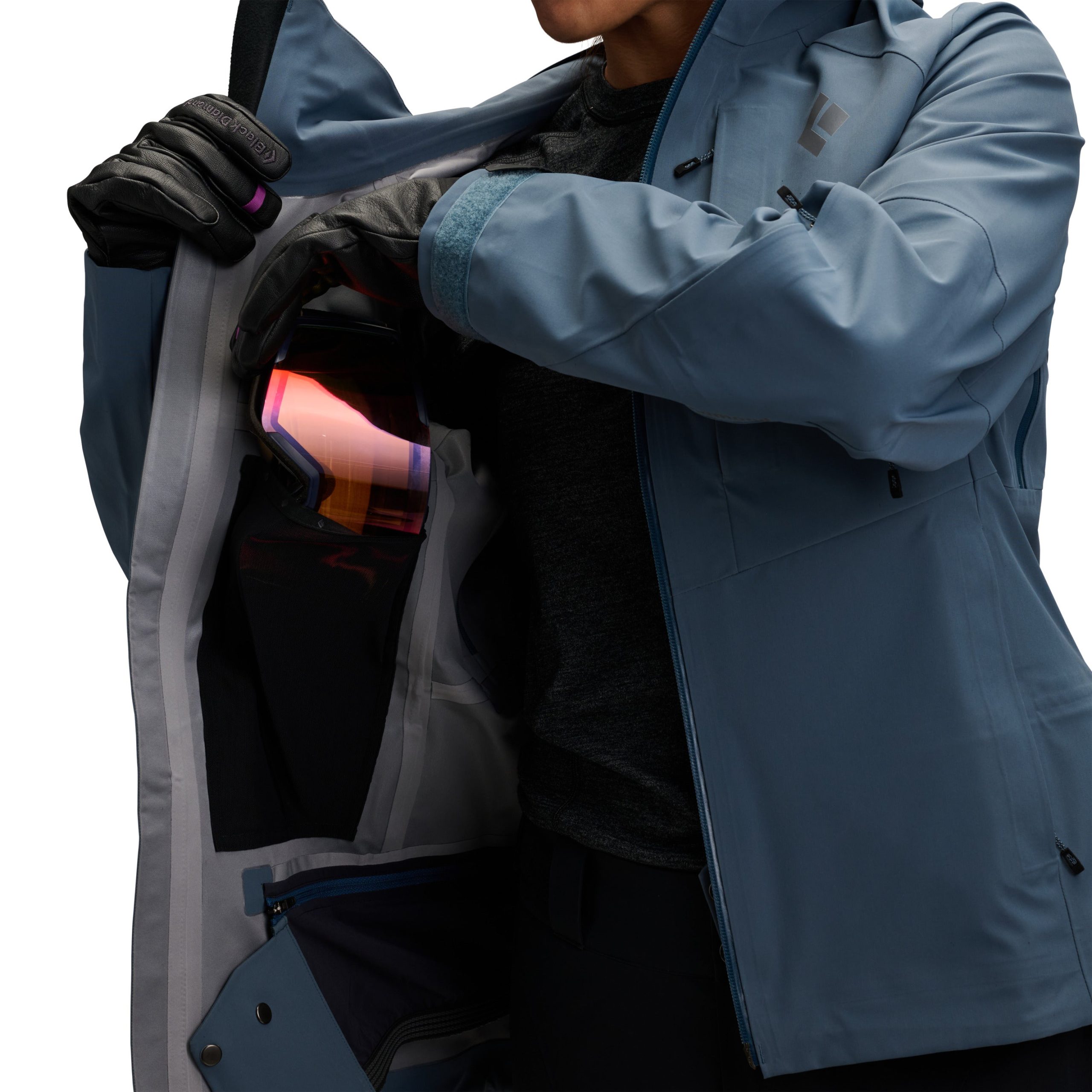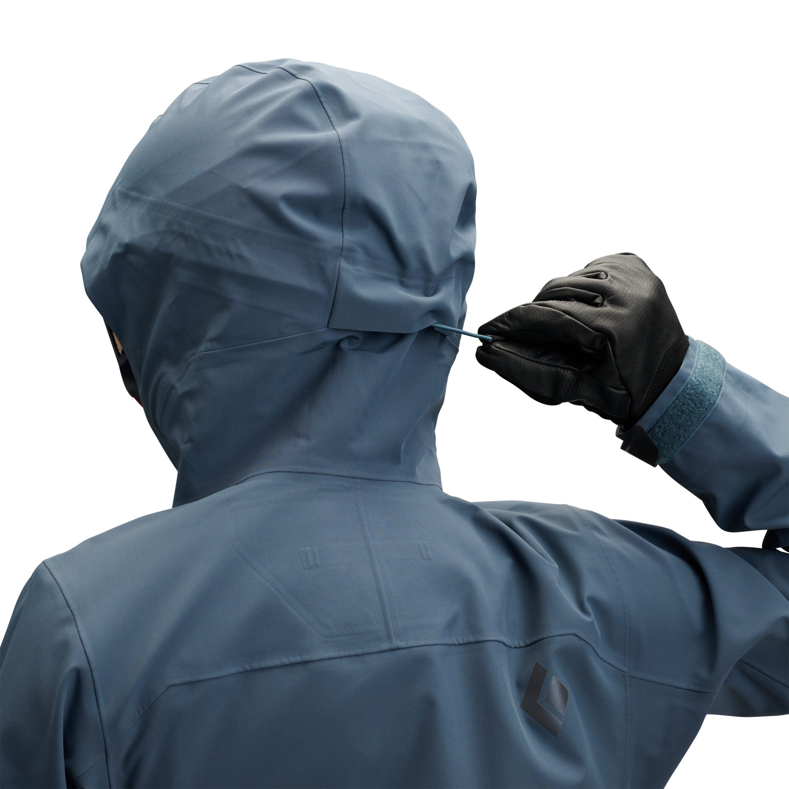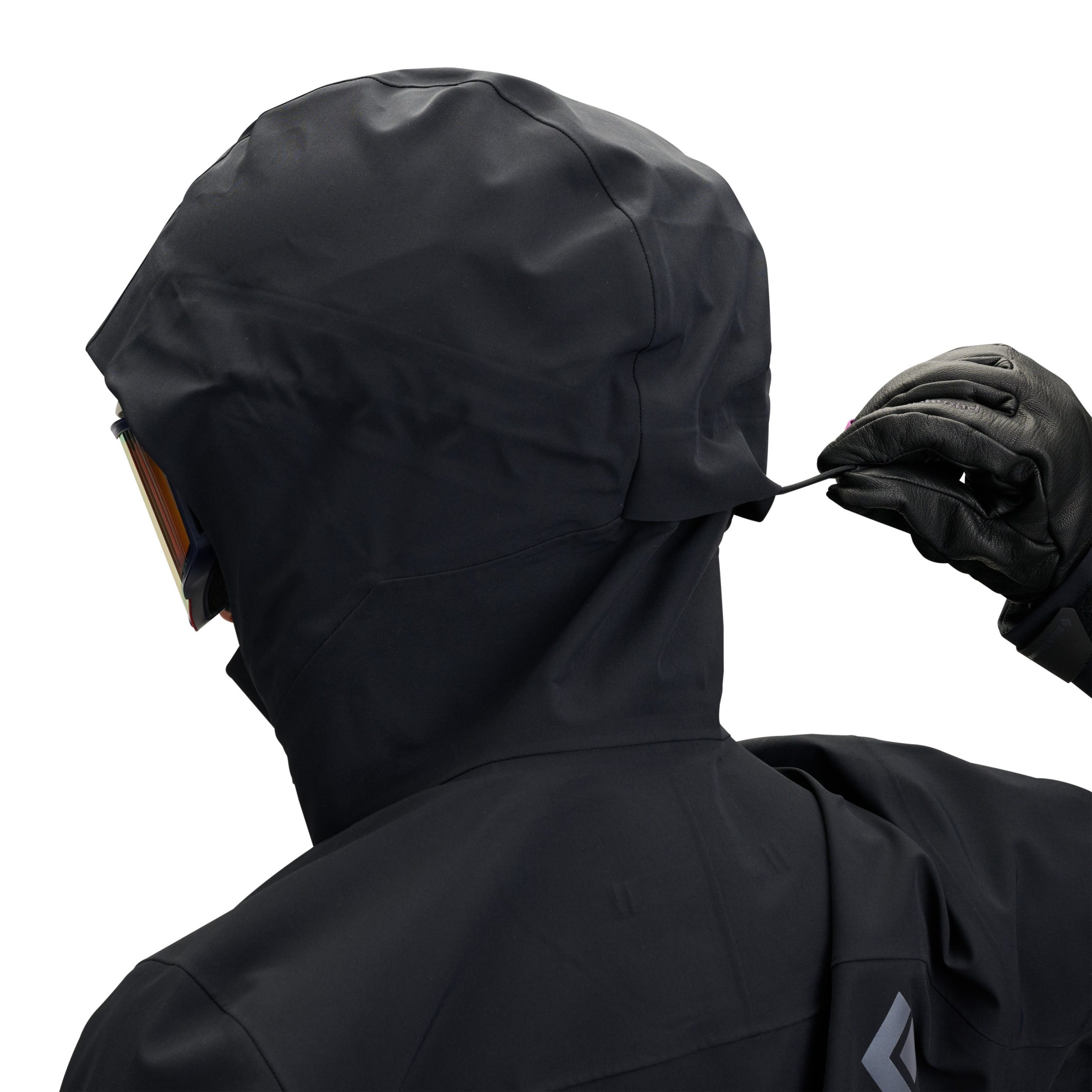 the Recon Stretch Shell is built with durable BD.dry? 3L stretch nylon fabric with a DWR finish without intentionally added PFAS. With one chest pocket for essentials and two mesh internal drop pockets for skins or extra layers. the Recon features ample storage. while the jacket’s removable powder skirt adds versatility for variable conditions. The Recon also has pit zip vents for easy temperature regulation on the skin track. a waterproof front zipper. and a ski-helmet-compatible hood for added protection on storm days. Pattering and fit allow for freedom of movement and all-day comfort. Internal RECCO? technology makes you searchable.